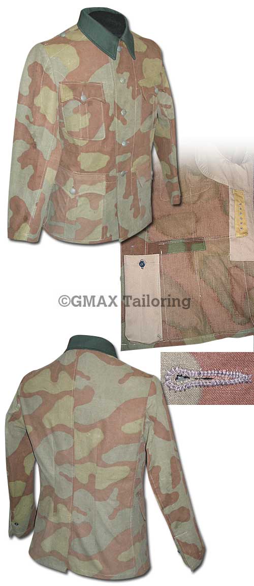 One of our repeat customers witshed to have a field made jacket made of Italian camouflage material. He supplied the material and we made a jacket with deeply scallopped M36 style pockets and a wool green collar, reflective of a 'veteran' NCO or officer for field use.